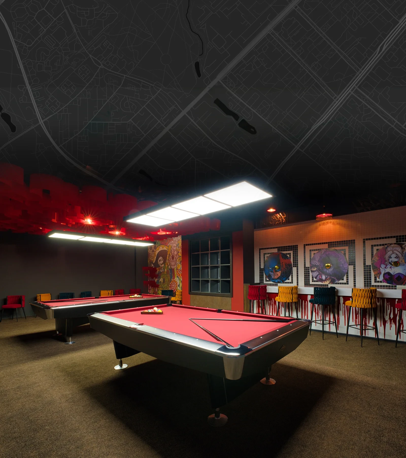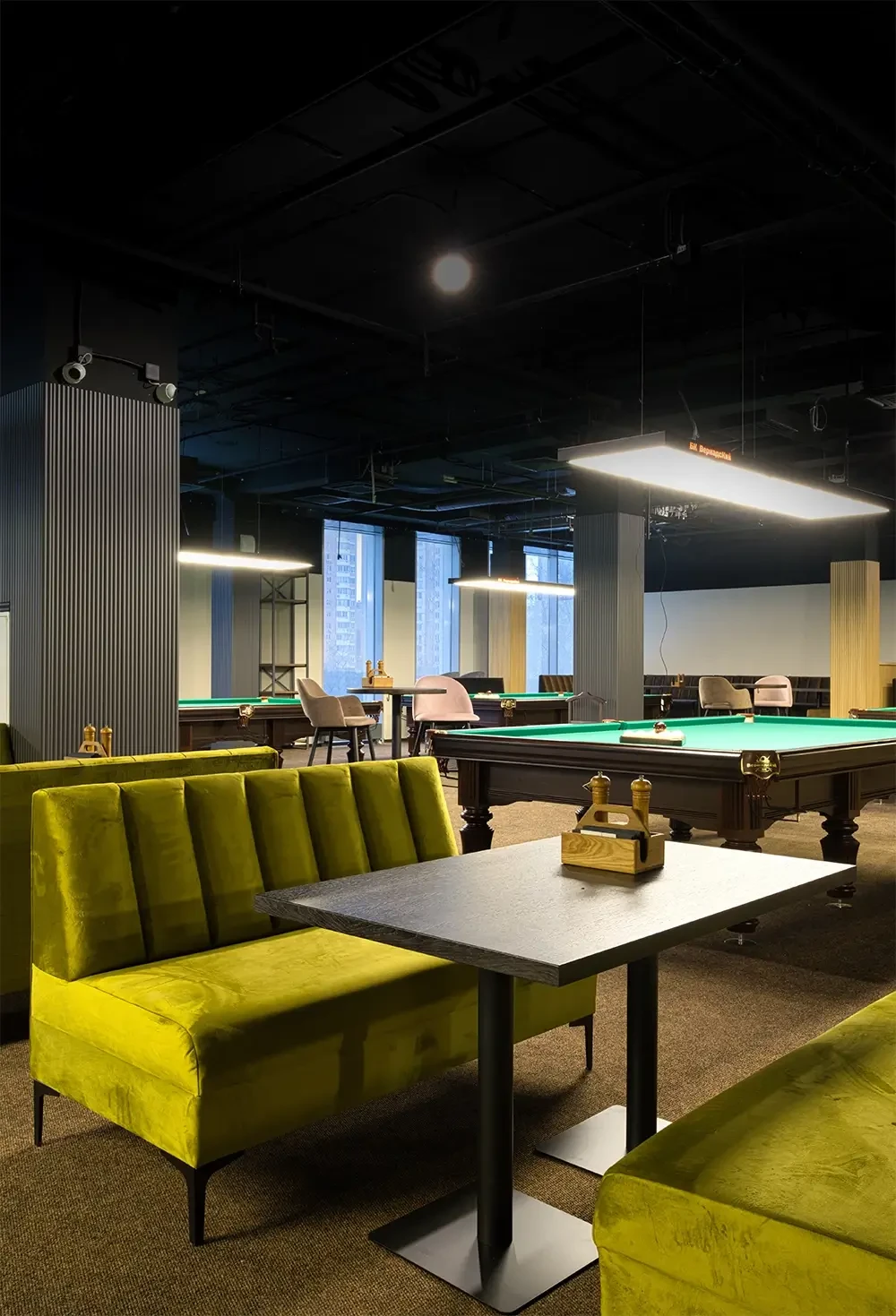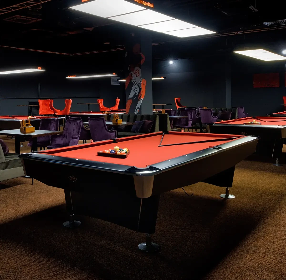 Наш большой зал оборудован 14 столами для игры в русский бильярд.